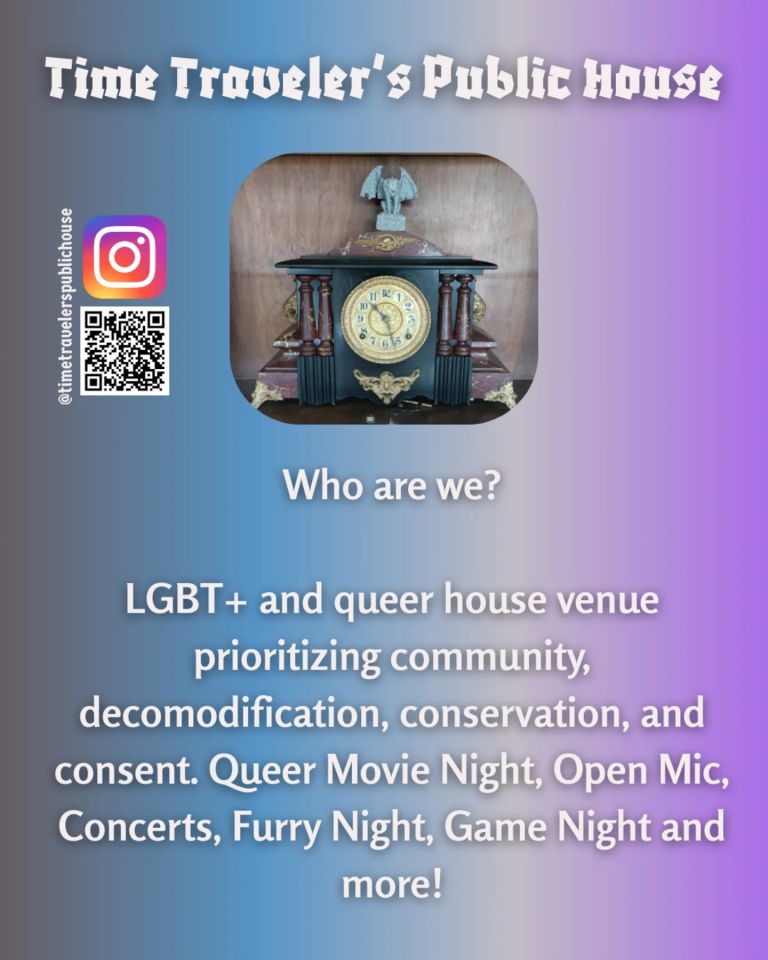 Time Traveler's is a diy queer focused venue located in Brooklyn Center mn. We love the spirit of folks that make it happen! Time Traveler’s creates spaces for those that struggle to find community. They create space for those seeking opportunities to present art. They create space to cultivate nature! We sat down with co founders Abi and Bex to find out more about this unique venue.