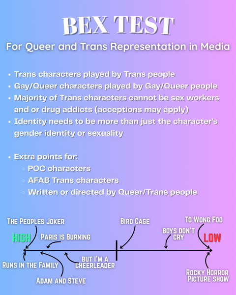With the Bex Test, I'm not just checking that box that the movie has a queer character in it. There's a sort of sliding scale spectrum from good to poor representation. The non-negotiable factors are LGBT+ characters must be played by corresponding LGBT+ actors gender and sexuality wise. Queer characters also can't have their gender or sexual orientation as their entire personality. These are flattened out characters that we don't need to see anymore of.