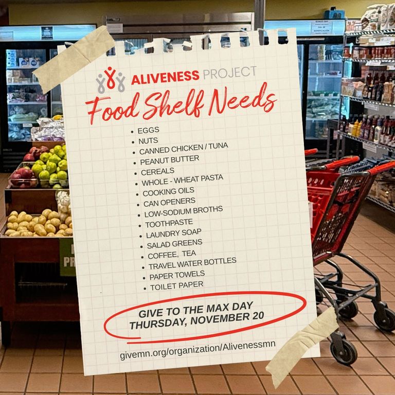 Right now, the needs of our community are rising. With SNAP benefits limited, grocery prices at an all-time high, and healthcare access under pressure, more of our members are turning to Aliveness for help. Our Food Shelf, meal program, and wraparound services are lifelines, but we can’t do this work without your support.