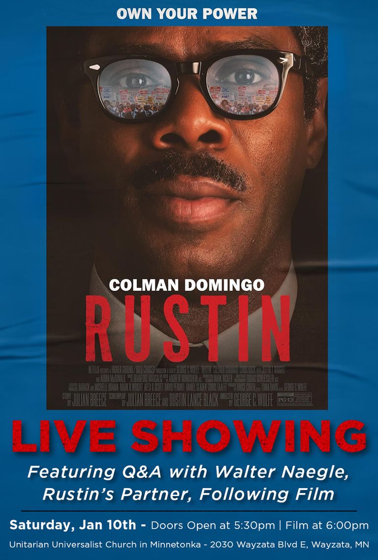 To honor Rustin, and note this early 1947 Minnesota connection to his nonviolence teachings, The Unitarian Universalist Church of Minnetonka is hosting a showing of the movie Rustin. The 2023 movie, starring Colman Domingo, showcases Rustin’s eight-week effort to organize the 1963 March on Washington. Rustin, a homosexual, had to battle not only the raw racism of the times, but the open homophobia of his fellow civil rights organization leadership and society.